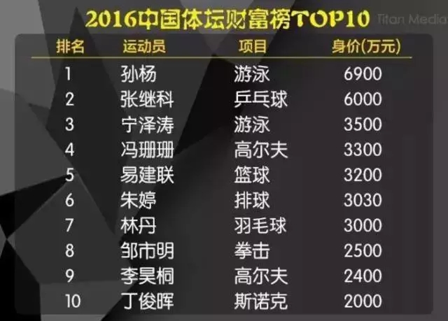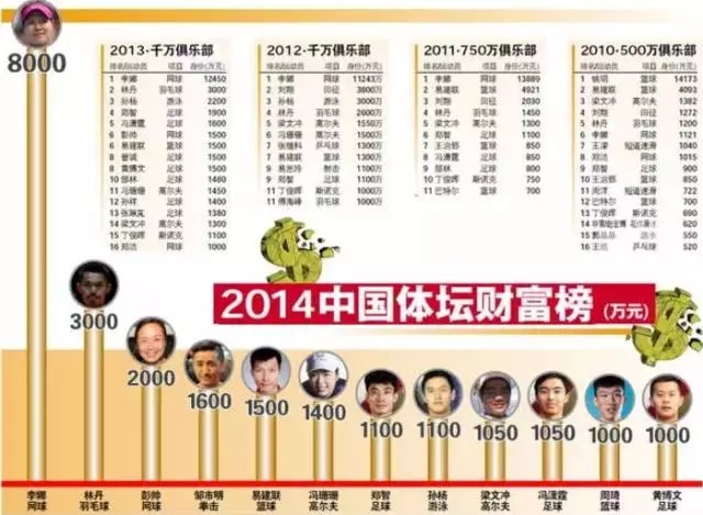 这份榜单是综合统计比赛奖金、商业赞助、社会活动出场费等收入而构成的。而中国体坛富豪前十榜单也从2010年的500万俱乐部发展到今天的2000万俱乐部。在这份榜单的前十排名中,除了高尔夫和游泳有两人上榜,其余项目都只有一人。