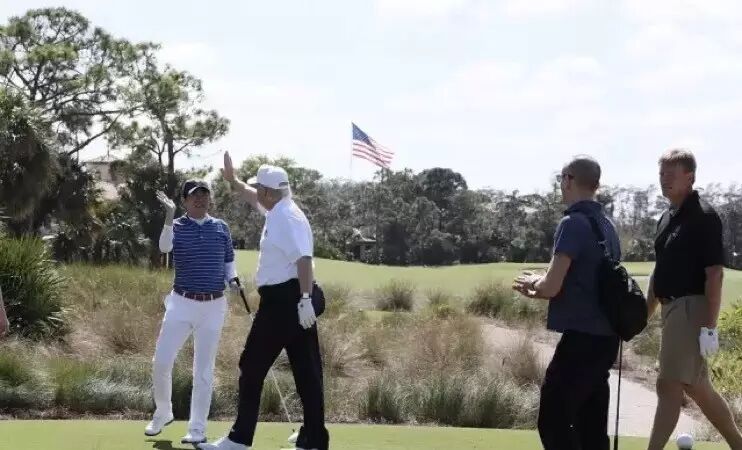 与日本首相安倍晋三在自家球场一起挥杆
